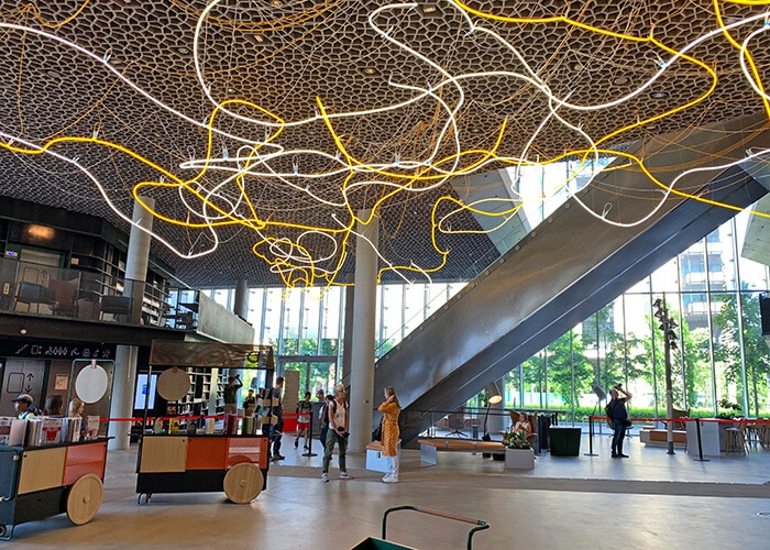 The library’s glass facade is fully transparent at street level, supporting the bright and relaxed learning atmosphere architects sought to create in the main room. It’s also well suited to the library’s shape, which is long and deep. In the evening, the light from the building shines out and illuminates the area’s bustling street life.