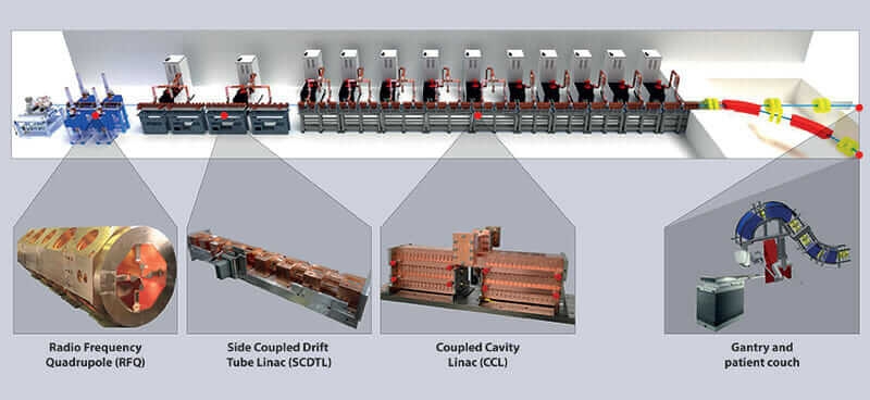 The theoretically endless path inside a circular cyclotron or synchrotron means gradually accelerating the particle until it reaches the needed output, but a linear system doesn’t have that endless distance. There’s one short path to get particles from stationary to sufficient energies before they enter the body.