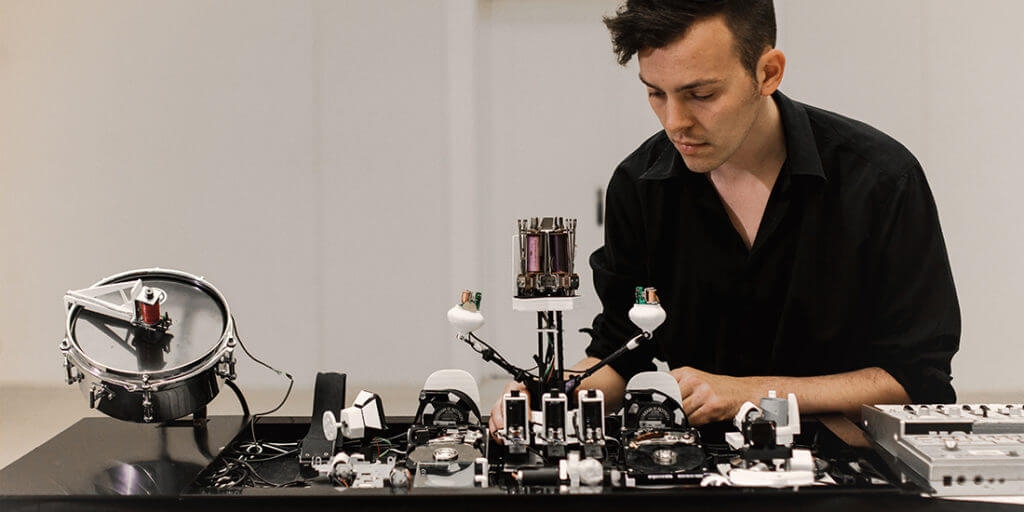 Classically trained on piano and clarinet as a child before playing in Krautrock and punk-rock bands for years, Geist studied and worked in electrical engineering before taking the leap into a creative life that merged his love for music and robotics. His first musical installation, 2012’s MR-808, re-created a famous drum machine as an oversize interactive instrument with robots playing acoustic drums.