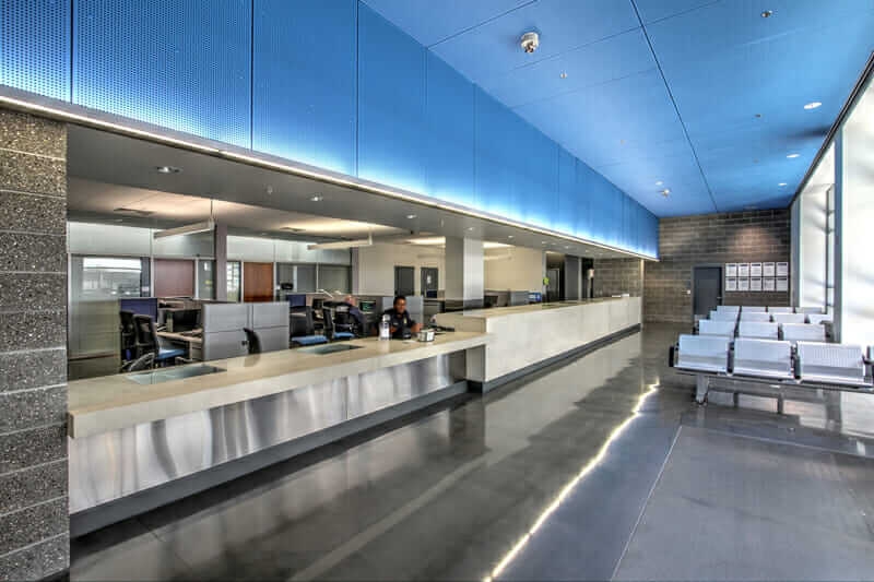 Besides sheltering travelers from the sun, the canopy also provides relief for its officers from the heat and the toxic exhaust from idling cars. “Shading was a big requirement for the officers working in the intense sun all day,” Misel says. The translucent ETFE provides shade while also keeping the space well-lit, 24 hours every day, with a night-lighting system that bounces off the canopy. The canopy is also outfitted with an HVAC system that delivers a curtain of fresh air to cool the area down and offset the high CO2 levels from idling vehicles.