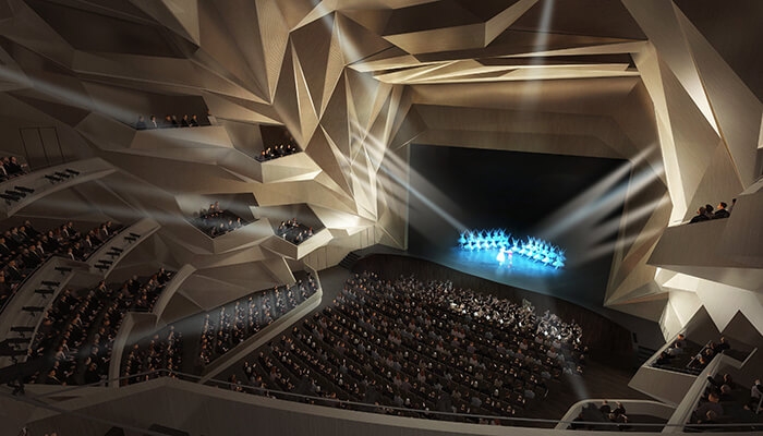 Hadid’s distinct style is evident here: undulating lines, curves, and fluid shapes that take cues from the adjacent river and Arabic calligraphy. The project includes an 1,800-seat theater, a 7,000-seat open-air amphitheater, a smaller theater, workshop spaces, and a restaurant with panoramic views. The main auditorium displays a crystalline geometric pattern inspired by traditional Moroccan muqarnas—the ornamental vaulted ceilings often seen in Islamic architecture—yet its overall form is futuristic.