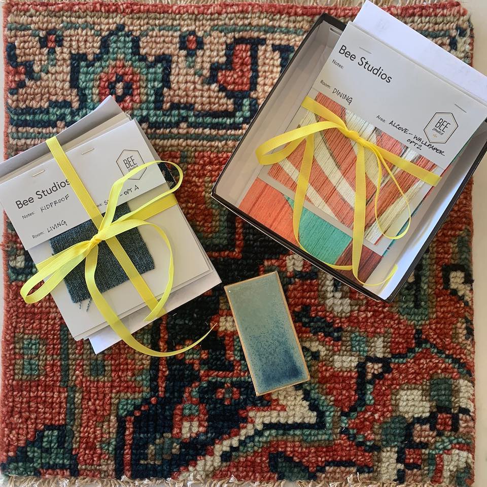 Brooke Eversoll, owner of Bee Studios, creates physical parcels containing vision boards, tear sheets, and material samples which are sent to clients in advance.
