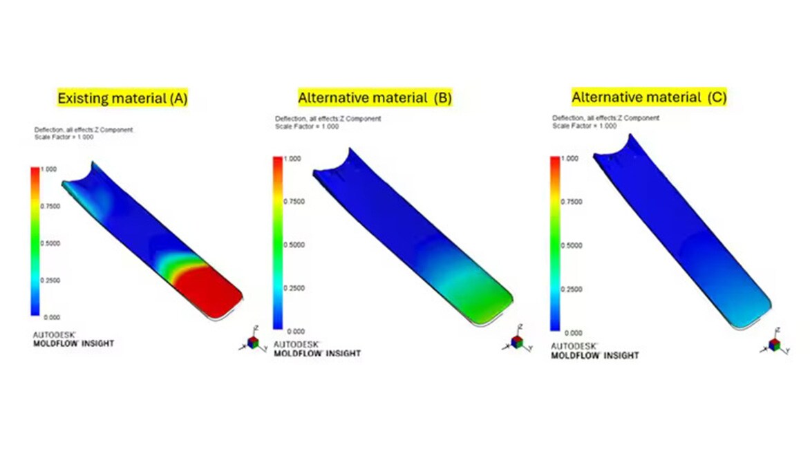 As a startup committed to delivering innovative products, Atomberg constantly seeks to bridge the gap between design concepts and manufacturability. However, challenges arise, particularly in mold design and analysis for plastic parts, due to the inherent complexities of polymers. Quality issues often occur due to the interplay of parameters and varying conditions during production. A key challenge emerged during the development of an innovative ceiling fan when the fan blades, designed for best-in-class aerodynamic performance, experienced excessive warpage and prolonged cycle times, significantly impacting production efficiency and quality as shown in Figure 1 - Material A. The blades, with an average wall thickness of 7mm, exhibited warpage at the outer ends due to uneven shrinkage during the cooling process from high to low temperatures.