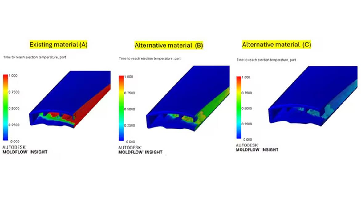In the first iteration, the team selected a plastic material B with similar mechanical strength to the original. As shown in Figure 1 & 2 for Material B, Moldflow simulations demonstrated a 26% reduction in warpage and a 25% decrease in the time to reach ejection temperature, significantly improving the process. However, the results still left room for enhancement. Shantanu Chanda (Specialist Moldflow Simulation) conducted multiple iterations of Moldflow simulations to provide enhanced insights and valuable data.