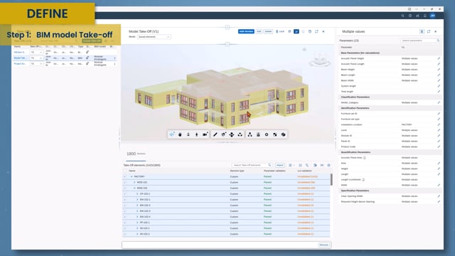 BIM-based take-off and multi-dimensional BOM analysis across all resource types (product, labor, service and equipment).