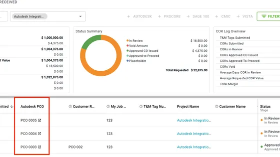 Every COR — whether field-generated or office-created — lives in Clearstory’s live, shareble COR Log. With one click, you can push single or multiple CORs directly to an Autodesk PCO, either by creating a new one in Clearstory or linking to an existing record in ACC. That means your team spends less time rekeying data and more time keeping the project moving.