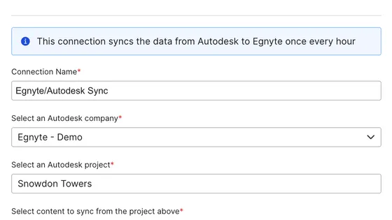 Keep teams aligned by directly syncing selected folders or entire projects from Autodesk Docs to Egnyte with minimal configuration. *Support field coordination, client updates, or owner deliverables with targeted, reliable transfers *Enable your end users to configure syncs easily and quickly. *Sync content for a single folder, multiple folders, or a project with just a few clicks.