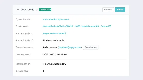 Embed Egnyte windows such as Files, Copilot Hub, and Upload Links directly within your Autodesk Construction Cloud account and project dashboards for easy access. *Access Egnyte features without leaving ACC. *Streamline file access across platforms. *Boost adoption with integrated, in-context project visibility.