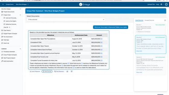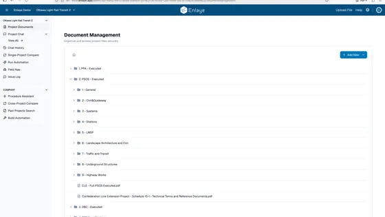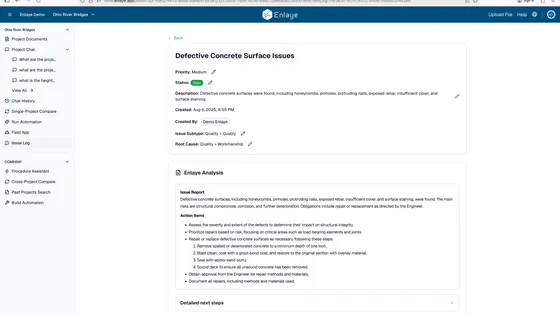 Once projects are complete, Enlaye consolidates Autodesk project data into structured, searchable intelligence. Companies can analyze trends, learn from past risks, and continuously improve future project delivery.