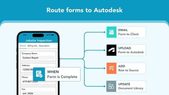 The GoFormz and Autodesk Construction Cloud integration enables the seamless exchange of data and documents between the platforms. Using GoFormz, construction teams can fill out forms in the field and instantly route completed documents and collected data to Autodesk Construction Cloud. Form data can be used to create or update Autodesk objects in real-time, making it easier than ever to keep your project data current, accurate, and centralized. Data can also be pulled from Autodesk to instantly populate and dispatch GoFormz forms to field teams, ensuring accuracy and accelerating field workflows.
