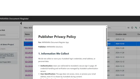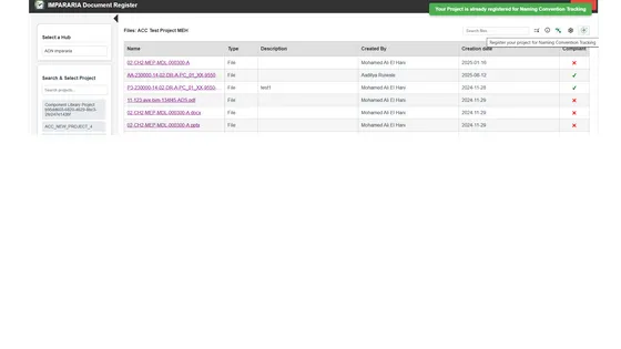 Smarter ISO 19650 compliance and file visibility within Autodesk Construction Cloud® (ACC). Managing file name compliance across large ACC projects is time-consuming and prone to human error. The IMPARARIA Document Register App simplifies this by providing a clear, real-time view of ISO 19650 compliance across all project files—right within your ACC environment. This app is built to complement, not replace, ACC’s native naming convention features. It enhances control, adds reporting, and reduces manual effort—empowering your teams with visibility and early insights. Three Key Benefits Flattened File View All project files are shown in a single, table-based view—no folder navigation required. This makes it easier to scan, sort, and search files across the project. Automated ISO 19650 Naming Validation The app automatically checks file names during upload and shows compliance using clear status indicators—helping teams reduce rework and stay aligned. App-Level Compliance Visibility Without Project Registration Even if a project isn’t registered for tracking, the app still performs naming validation and highlights non-compliant files—providing early insight across all users.