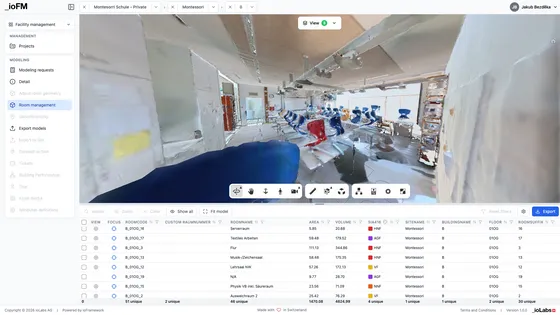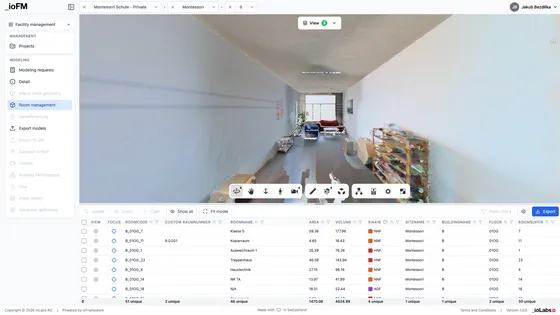 1. Rapid model creation: ioFM turns your existing materials — 3D scans, plans or combination of both — into a lightweight 3D model with a complete space and area inventory across rooms, floors, and buildings. We create lightweight and functional models at a fraction of the time and cost. Simply upload your inputs to ioFM, and the platform delivers an FM-ready digital baseline within days.