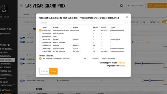 PLOT's Procurement tool calculates deadlines for when Material documentation needs to be Submitted and Approved, when the Material needs to be ordered, all based on the order's required on site date. This Required on Site date can be connected to activities in the CPM schedule.