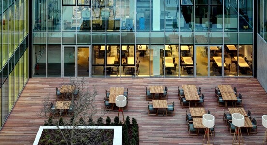 Anche i requisiti stringenti di sicurezza sono stati soddisfatti, grazie a un espediente che ha coniugato estetica a efficienza. “L’edificio è completato da una struttura esterna, un involucro di alluminio collocato a 6 metri dal perimetro dell’edificio che conferisce un’immagine unica ed elegante a tutto il complesso”, aggiunge Drago. Lo strato esterno, una vera e propria “pelle”, è stato infatti pensato con tutte le caratteristiche di una barriera di protezione ma, allo stesso tempo, non appesantisce la linea estetica né è vissuto, per chi lavora all’interno, come un elemento di separazione dall’ambiente circostante.