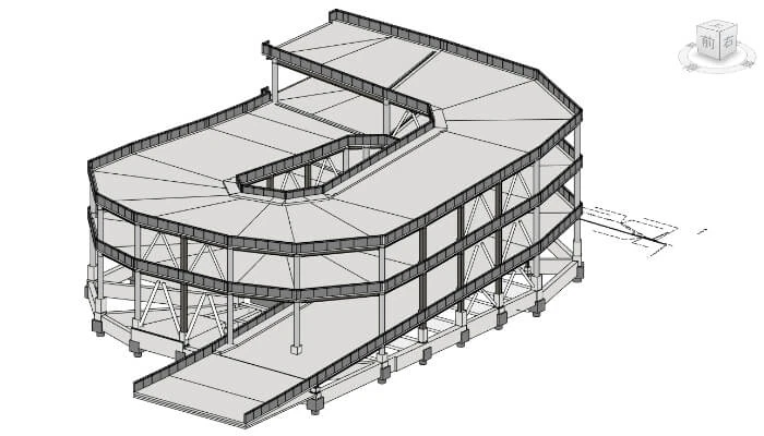 「ランプ棟の施工図を作るにあたっては、手摺のファミリを作り、パラメトリックに動くようにしました」と、太江氏。「床のレベルに沿うようにパラメーターを入れていくことで、手摺が自動的に動きます。傾斜の付いている建物を図面にするのは難しいのですが、整合性の高い平面・立面・断面の図面を作成できました」。