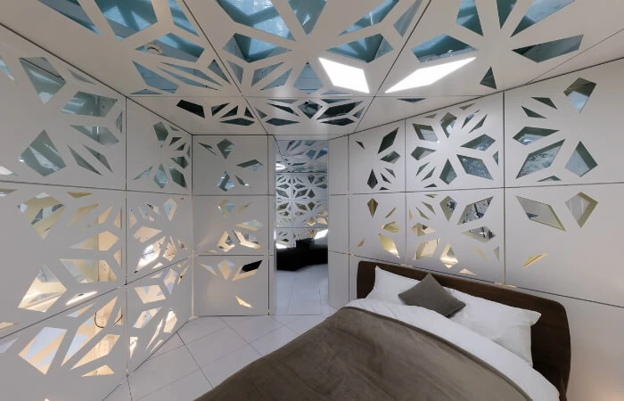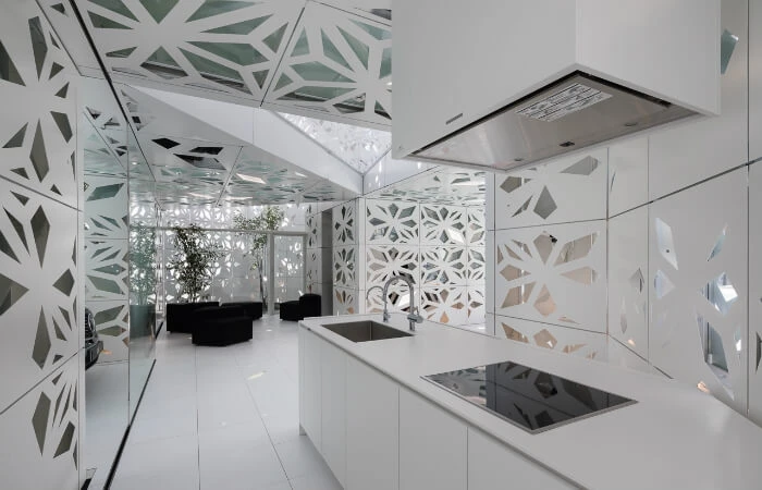 ショールームながら実際に生活することも可能なEQ Houseで、ひときわ目を引くのが壁面や屋根を構成する内外装パネルだ。850mmx850mmの各パネルは、直達日射量や人口照明負荷、レーザーカットの作業時間に基づく施工性を検証した上で開口部が決定されたもの。全1,200枚のパネルのうち、実に1,000枚以上が異なる開口形状となっており、美しい木漏れ陽のような光環境を生み出すことができる。