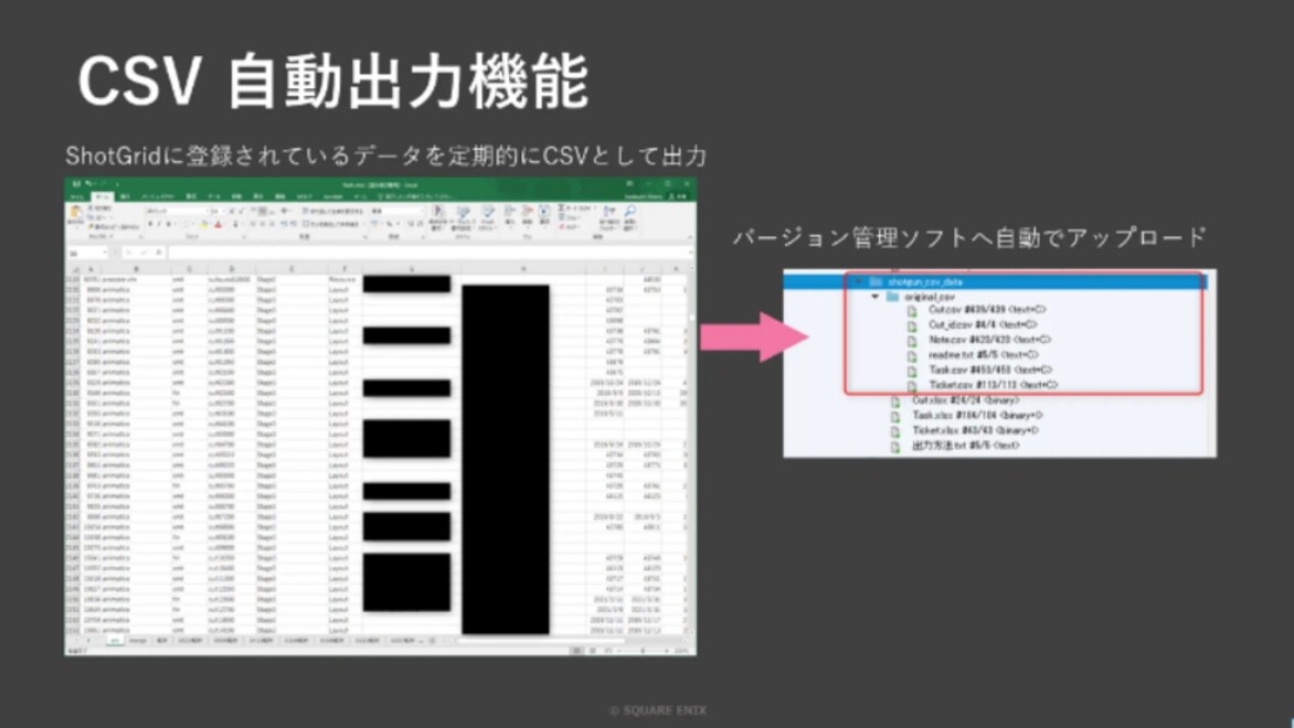 스즈키 씨는 Flow Production Tracking의 프로세스 모니터링에 집중하는 동시에 일부 작업의 데이터는 Excel을 사용해 확인했다고 말합니다. 당시 그는 Flow Production Tracking의 'CSV 출력 기능'이 매우 편리했다고 말합니다. "Flow Production Tracking에서 필요한 데이터를 CSV 형식으로 내보낸 다음 관리를 위해 Excel에서 자유롭게 관리할 수 있습니다. 저는 개발팀에게 CSV를 자동 출력하는 툴을 만들어 달라고 요청했습니다. 제작 상황은 빠르게 변하고 자주 업데이트가 필요하기 때문에 수작업으로 제작한 관리 차트임에도 불구하고 Flow Production Tracking의 마스터 데이터를 기반으로 매번 정확한 정보를 확인할 수 있어서 큰 도움이 되었습니다."