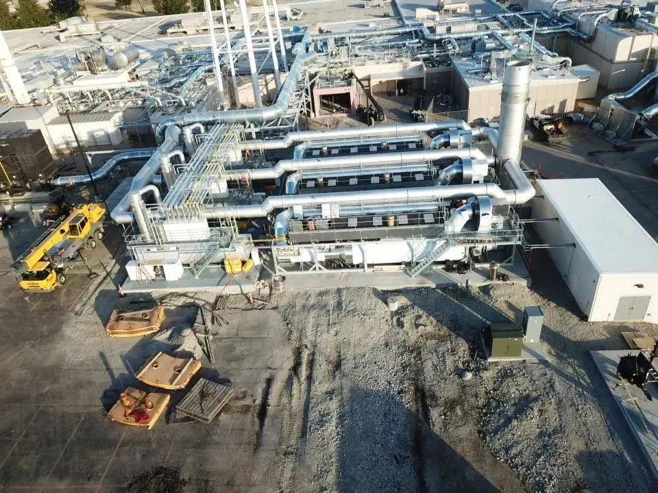 Aerial view of an industrial facility with extensive metal piping, ducts, and equipment arranged across a large concrete site.