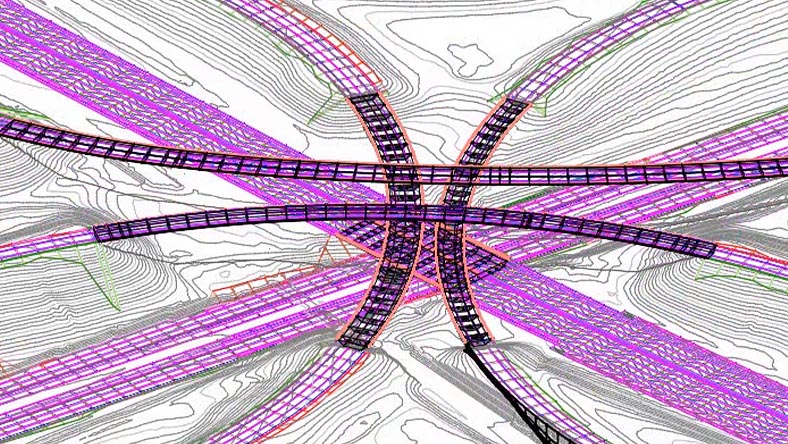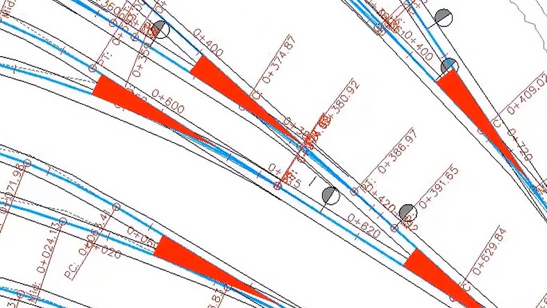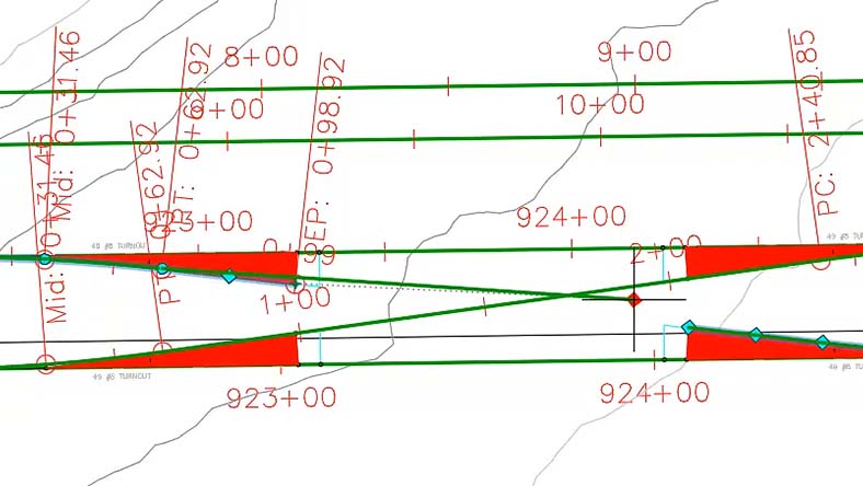 Create dynamic and data-rich corridor models for highways and roads. Build rail track corridor models, incorporating designs for switches, turnouts, and cant calculations.