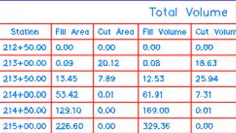 Use materials and sectional or profile information to create reports for volumes along an alignment, comparing design and existing ground surfaces, and quantity takeoff.