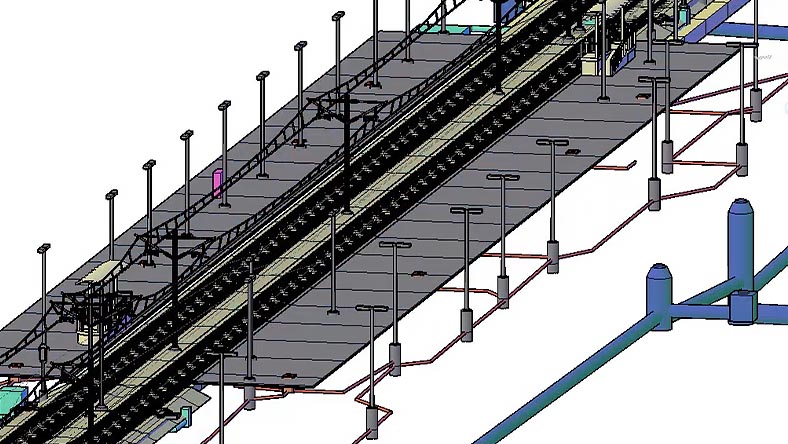 Build 3D track corridor models, including alignments, profiles, and assemblies. Incorporate designs for switches, turnouts, platforms, and calculations for cant.