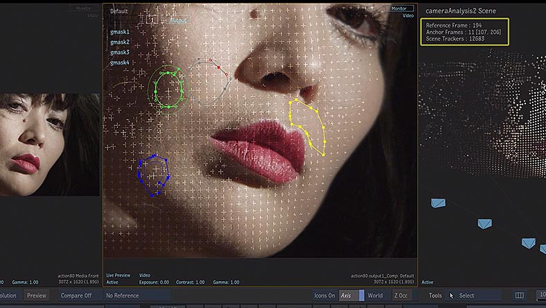 Generate 3D point clouds from 2D camera sequences to position objects in a scene, apply masks, and color grade.