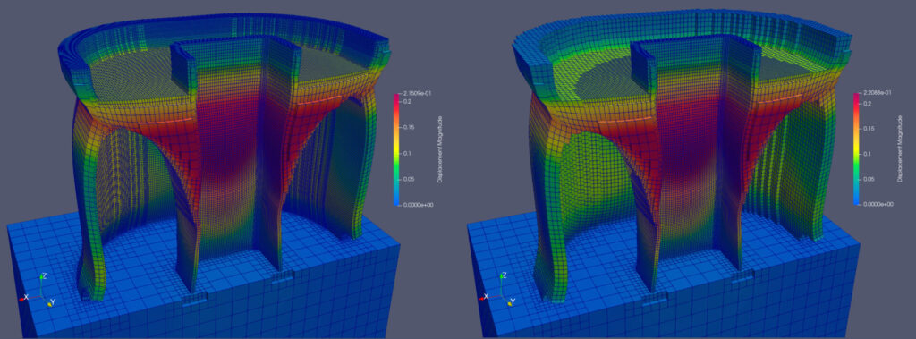 Figures 5 and 6 show displacement contours (10× warp factor) for simulations with and without feature-aware meshing, while Figure 7 compares displacements along the outer wall. The peak displacement differs by only 7.6%—0.172 mm versus 0.159 mm—demonstrating excellent accuracy retention.