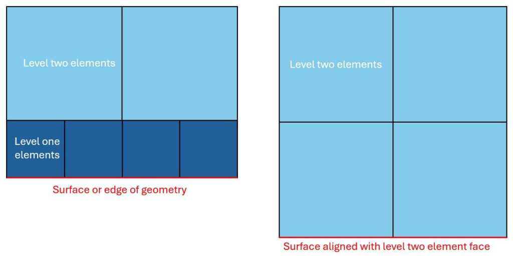 Thin walls and intricate features demand fine resolution with many small elements. This refinement, however, unnecessarily increases node and element counts in bulkier regions. While octree-based adaptive meshes can coarsen interior sections, surface regions still require refinement, adding more nodes and slowing performance. Even planar, axis-aligned surfaces can trigger unnecessary refinement depending on how they align with the super-element grid (see Figure 1).