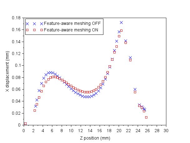 | Metric | Feature-aware meshing off | Feature-aware meshing on | Percent change |