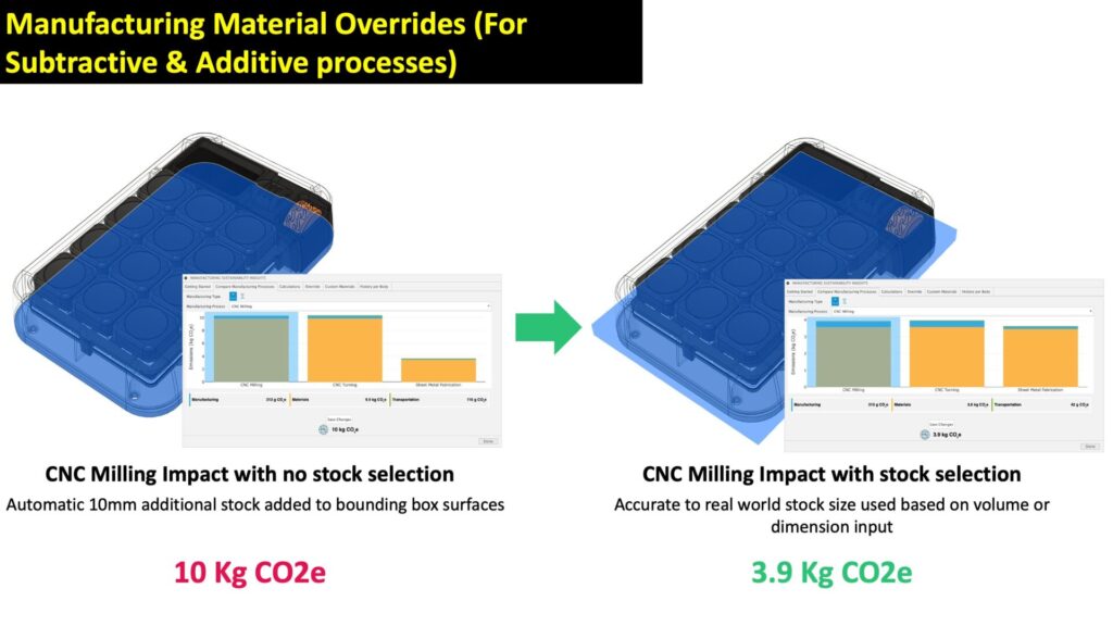 In MSI V2, users can now specify the exact stock material dimensions for their projects. Whether working with CNC machining or additive manufacturing, this feature ensures accurate calculations of material usage, waste, and carbon emissions. By selecting the precise volume or billet size, designers can achieve more precise data and a clearer picture of their project’s environmental impact.