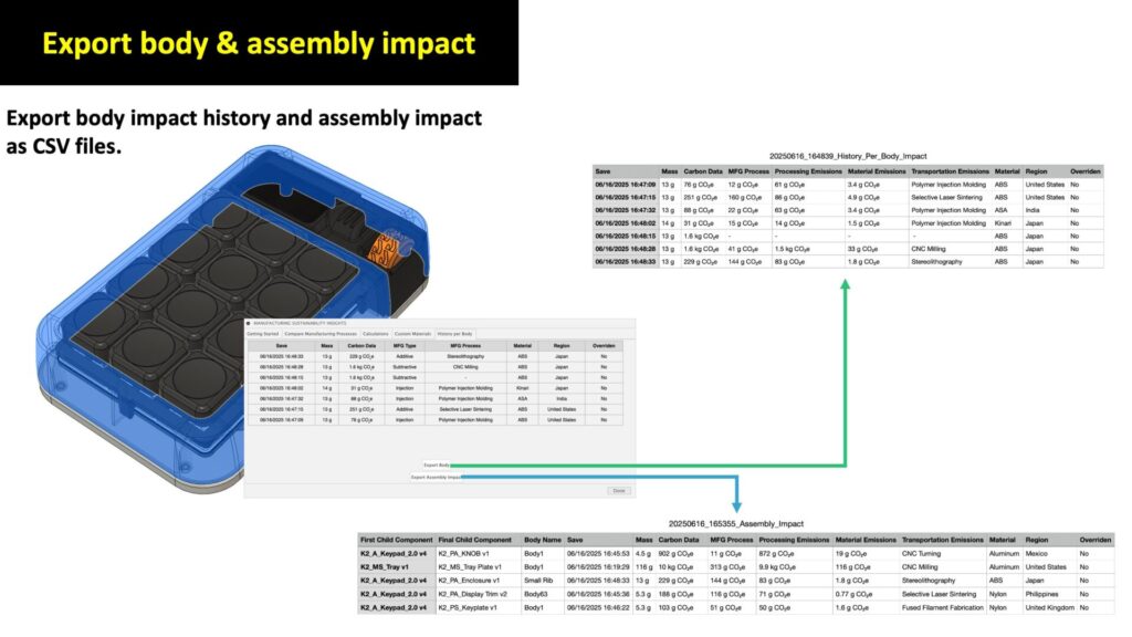 To facilitate the integration of sustainability data into broader workflows, MSI V2 offers two streamlined export options. Users can export the entire body history as a CSV file, providing a detailed, timestamped record of every design decision, manufacturing process, and associated carbon footprint. Alternatively, exporting an entire assembly as a CSV captures the most recently saved calculations for each component. These options simplify the process of generating charts and comprehensive impact reports, enhancing the usability and flexibility of MSI.