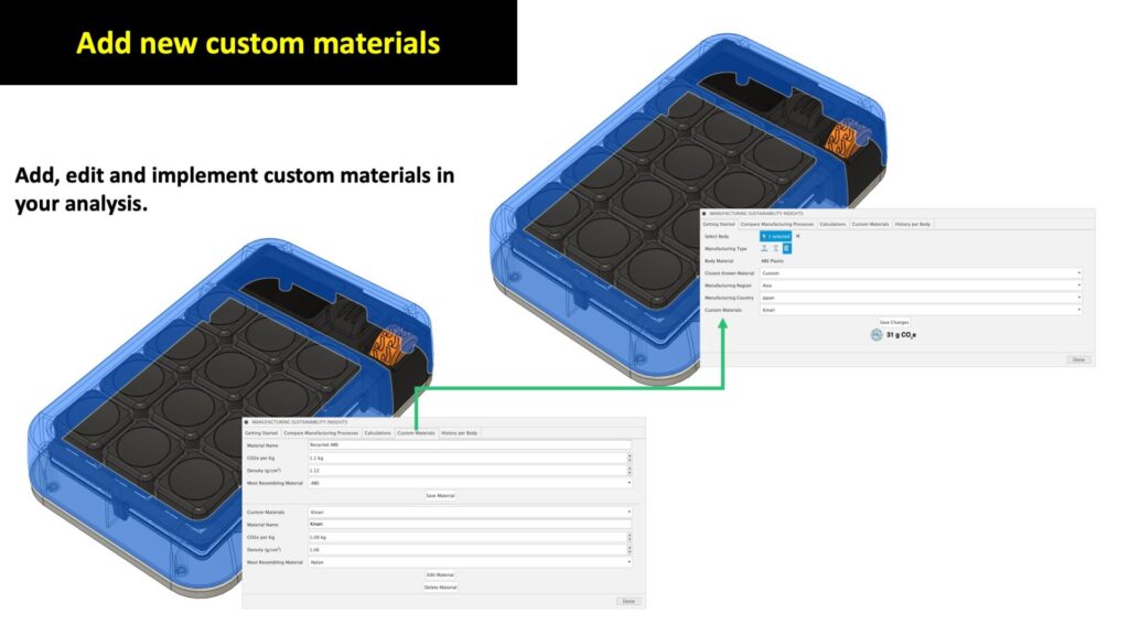 MSI V2 introduces custom material overrides, allowing users to input their own materials with specific carbon footprint data and density values. By selecting the closest similar material from the existing library, MSI maintains accurate processing parameters while offering flexibility across different manufacturing scenarios. This enhancement empowers designers to tailor MSI’s calculations to their unique material needs, resulting in more accurate and personalized sustainability insights.