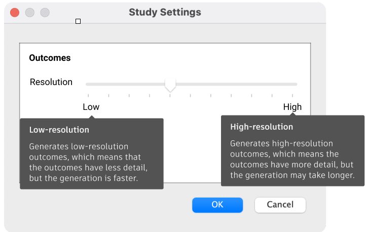 We improved a few aspects of the Study Settings dialog so that it is easier and more intuitive to use. You will now see updated nomenclature, slider tick marks, and new tooltips explaining what high/low-resolution setting means.