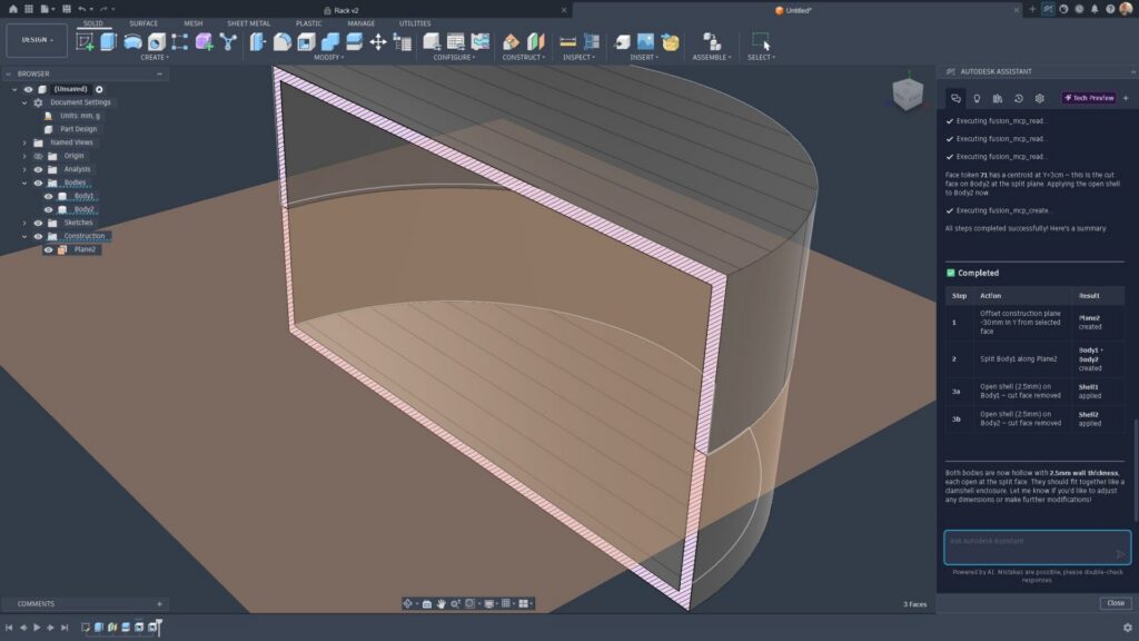 “Create an offset construction plane 30mm in -Y direction from the selected face, then split this body along that plane, then shell the inside of both bodies to 2.5 mm to create an “open” shell (use cut faces by default.) Propose the steps first and wait for my confirmation”