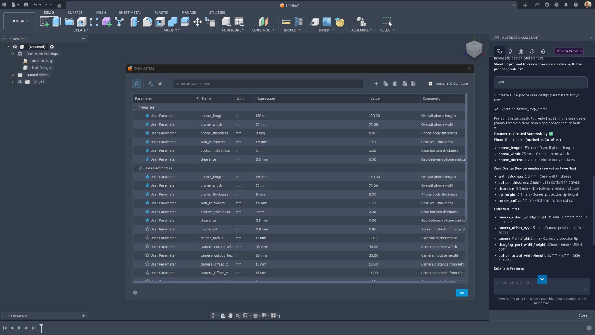 - “Create all the user parameters I would need to design a phone case (wall thickness, clearance, corner radius, camera cutout, etc.). Use mm, name them clearly, and propose the list before creating them.”