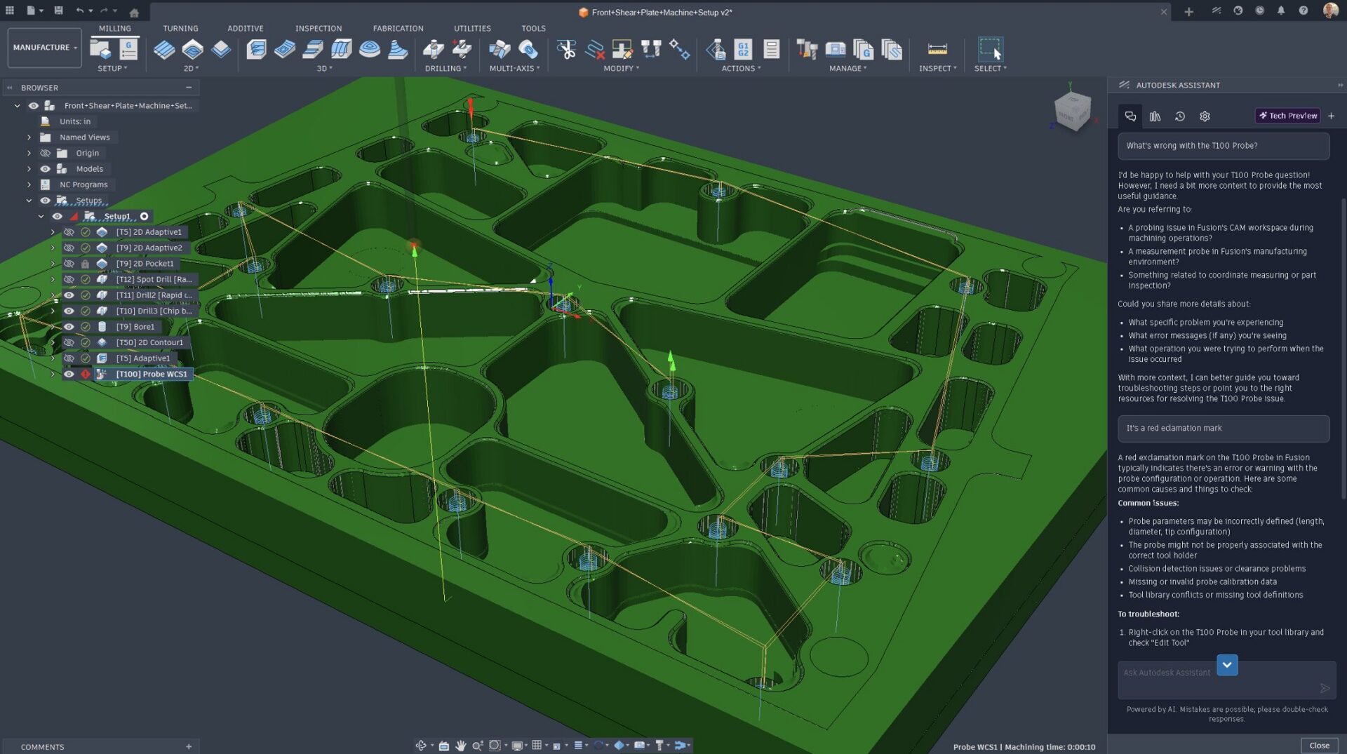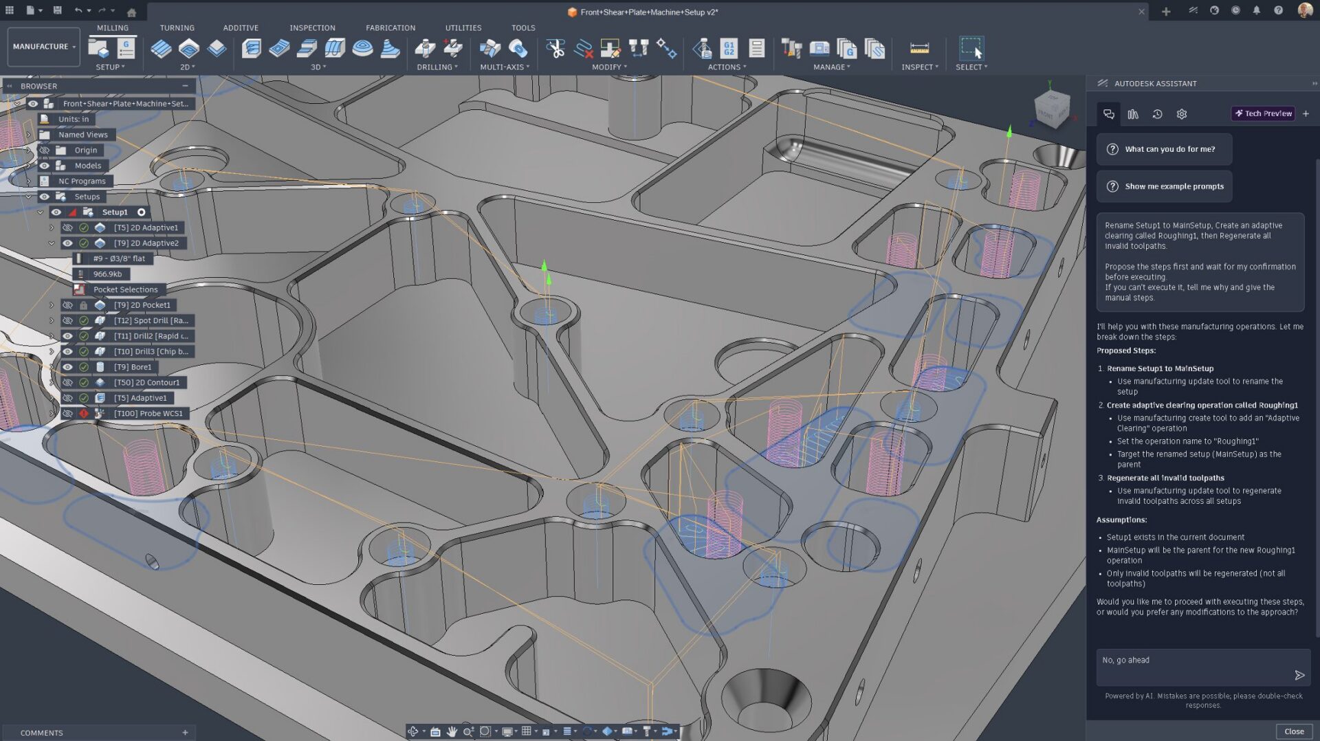 When you’re in the Manufacturing workspace, you can use the same “describe what you want” approach to create, update, rename, delete, and manage CAM items like setups, operations, and toolpaths without manually hunting through menus. (Coverage can vary in Tech Preview, so if something doesn’t run, ask for the manual steps.)