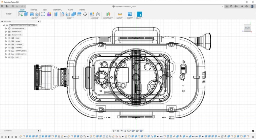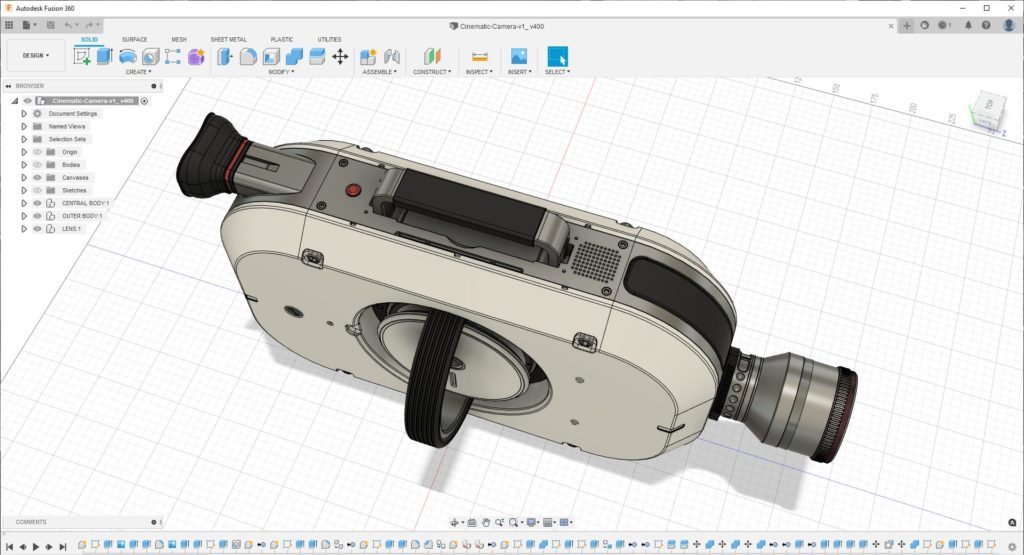 Damit war die SmartVision-Kamera geboren – zumindest in der Theorie. Die SmartVision ist zwar kein vollwertiger Prototyp, zeigt aber, was man mit Fantasie und 3D-Modellierung in Fusion 360 erreichen kann. Ein Blick auf dieses Konzept-Design genügt, um sich vorzustellen, wie man es im Urlaub oder zu Hause einsetzen kann. Das Camcorder-Gerät wird auf moderne Art und Weise an Ihr Telefon angeschlossen – ein Trend, den wir bei Technologien wie VR-Headsets beobachten können, die ein iPhone benötigen, um sie anschließen zu können.