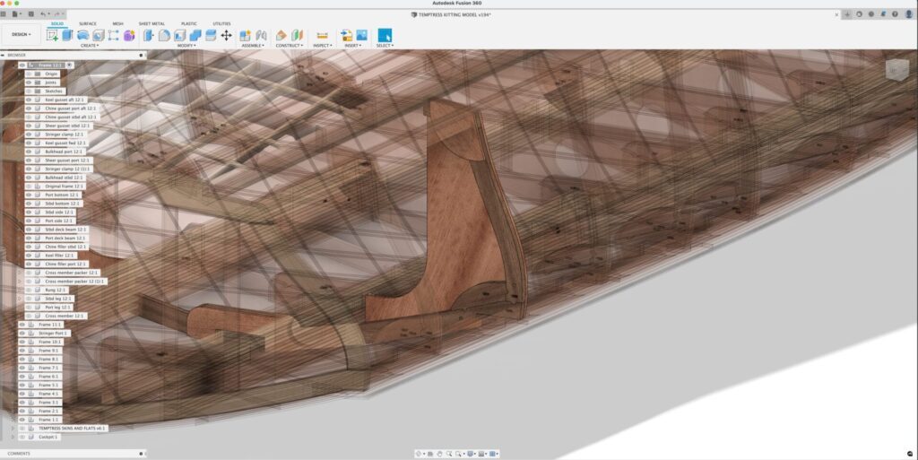 „Es ist eine Art, die Dinge klassisch zu halten, aber auch mit der Zeit zu gehen“, sagt Lee. „Der Designer entwirft das Bootsgerüst und schickt es mir zu. Ich baue es in Fusion 360 und verwandle es in verschachtelte Teile. Ich kümmere mich um alle Verbindungen in den Rahmen und stelle alle Vorrichtungen und Ausrichtungselemente her. Mit Fusion 360 kann ich eine Zeichnung in einen Bausatz verwandeln, den ich dann an einen Hersteller weitergeben kann, der den Bausatz fertigt.“