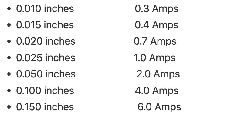 Traces that are carrying a lot of current will need to be wider than your standard signal traces to accommodate the heavier load. Here are some values that can provide guidance on how wide to make your traces for distinct currents:
