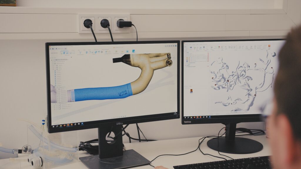 Dr. Schwenke and his team rely on Autodesk tools for their entire process. Typically, they isolate a relevant artery through a combination of CT scans and 3D rotational angiography (or 3DRA). After processing and prepping the data in Netfabb, the team can transfer the data over to Fusion 360. Once in Fusion 360, they can transfer the data to 3D print a physical, scale model of the artery.