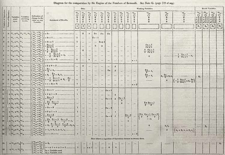 Her mother’s strategy worked. Ada was tutored in the mathematics and sciences of the day and flourished. At the age of 17, she met Charles Babbage, and a decade long friendship began. Despite the huge age difference, Babbage and Lovelace were equals in intellectual might. Babbage is mentoring Ada, and in turn, Ada starts learning about Babbage’s Difference Engine and Analytical Engine, and she’s entranced.