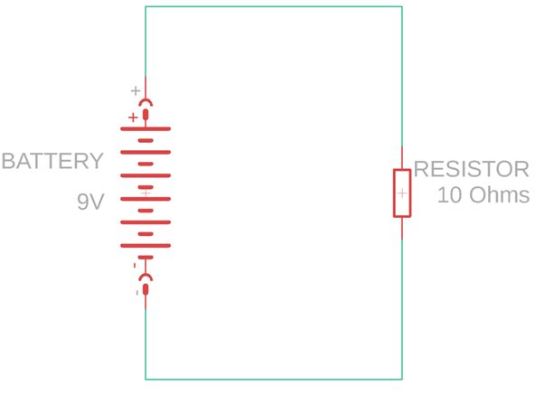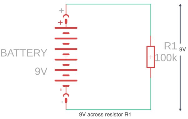 Nous examinerons les résistances en détail dans la section suivante. Le circuit ci-dessous montre comment la tension est mesurée entre deux points à travers une résistance.