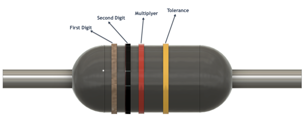 Le schéma de code des couleurs des résistances peut vous sembler un peu difficile au début, mais plus vous approfondissez vos connaissances dans le monde de l’électronique, mieux vous pourrez les interpréter. Chaque résistance axiale possède quatre bandes de couleur ; trois d’entre eux indiquent la valeur de la résistance, et la quatrième indique la valeur de tolérance de la résistance. Cette quatrième bande est de couleur argentée ou dorée.