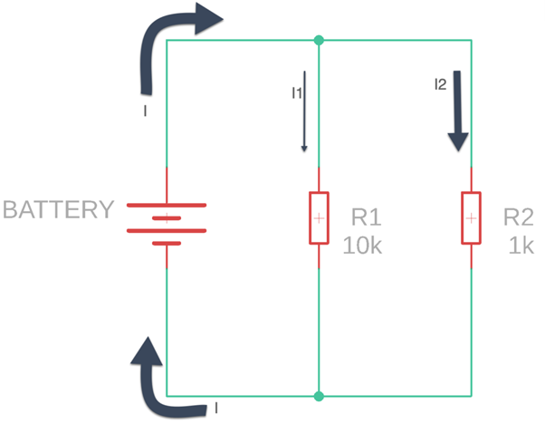 Dans la figure ci-dessus, nous avons des résistances R1 et R2 de 10kΩ et 1kΩ respectivement. Nous pouvons donc calculer la résistance totale comme suit :