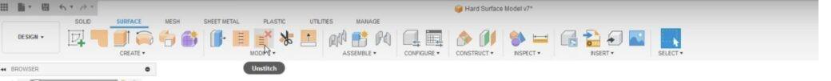 La troisième méthode, la plus complexe, consiste à utiliser l’outil Découdre disponible dans les outils de surface. Il s’agit de découdre une face du corps solide et de la convertir ainsi en un jeu de surfaces. Utilisez ensuite l’outil Ajuster pour supprimer les zones intérieures de la plaque et les sections qui se chevauchent de la poignée. Enfin, utilisez l’outil Coudre pour combiner les faces et la poignée en un volume fermé, que Fusion convertit en corps solide.