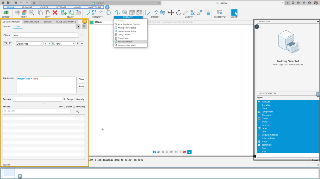 - This is another set of panels for our Inspector and Selection Filter. After selecting assets on the Schematic, the properties that can be changed will appear in the inspector panel.