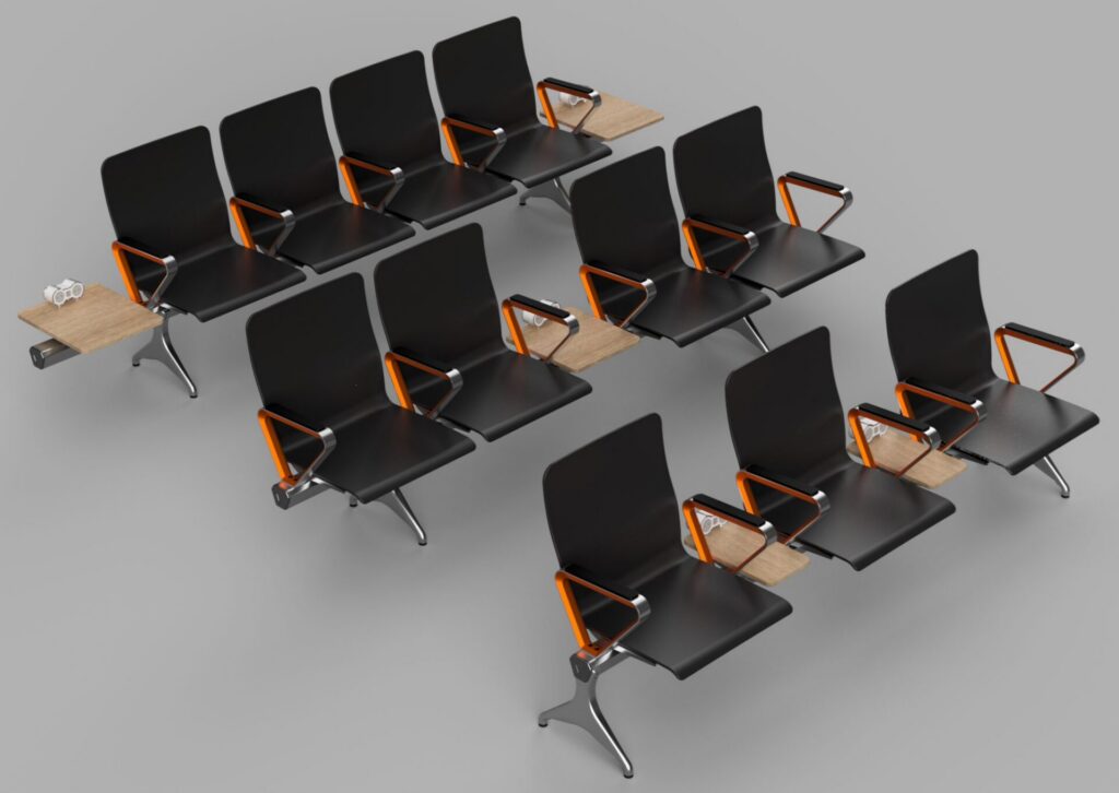 Figure 1: This configurable airport seating design supports a wide range of options, including variable length, seat count, armrests, tables, and power integration. With so many possible combinations, some configurations meet design requirements while others do not.