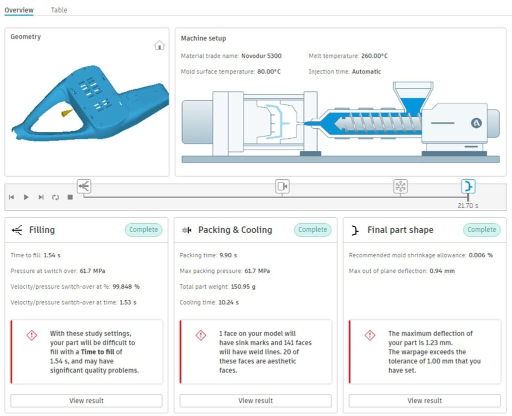 Il nuovo ambiente di post-elaborazione include un sommario dei risultati della simulazione, con utili animazioni che spiegano le diverse fasi del processo di stampaggio. Tale sommario può anche essere utilizzato per collaborare con altri.
