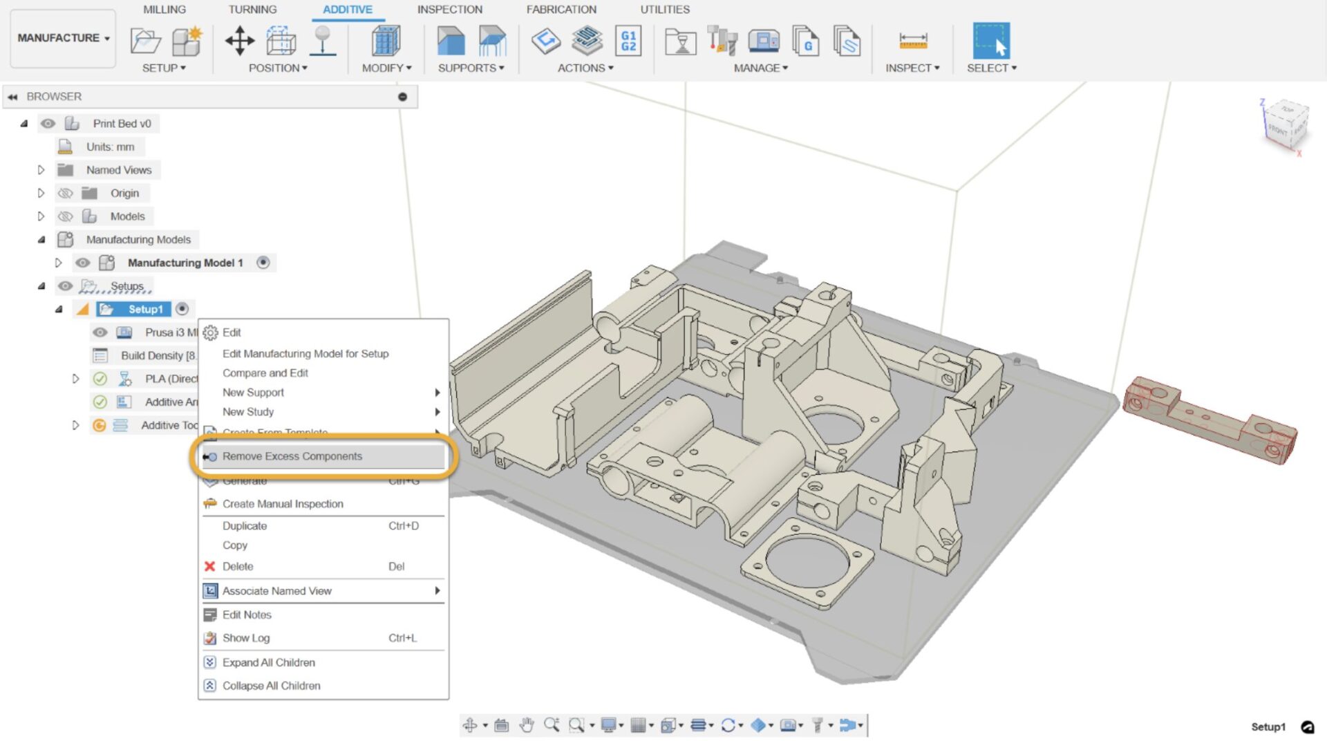After arranging parts within the build area or build volume of your 3D printer automatically, you may end up with excess parts that cannot be printed. In those cases, Fusion places them in row next to the build plate. Before generating support structures or creating the additive toolpath for the active setup, it is good practice to remove those parts from the setup, if we do not intend to print them in the same build. Using the new “Remove Excess Components” feature located on the right click menu of the active setup, you can now easily eliminate them from the active setup.