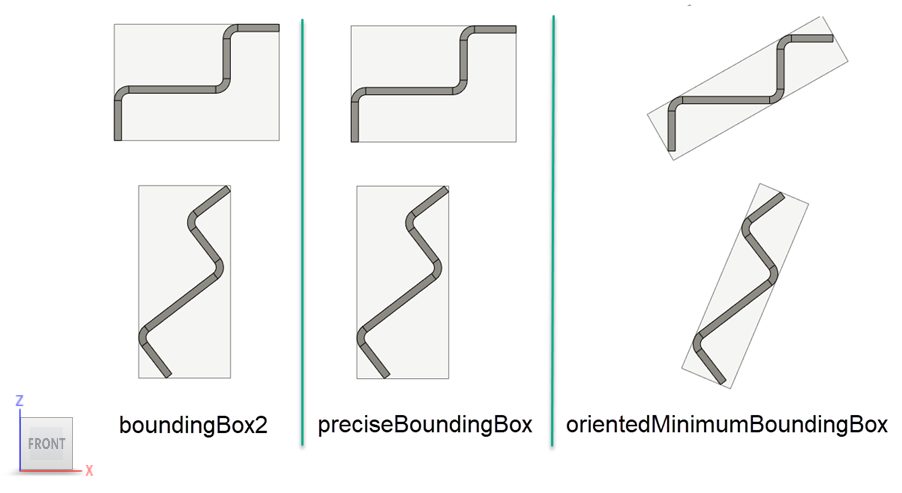 The most exciting enhancement is the new orientedMinimumBoundingBox. This has been requested for many years, and now, as a result of new functionality in Autodesk Shape Manager, Fusion can provide this capability. All the other methods compute a bounding box aligned with the coordinate system. This function returns an OrientedBoundingBox, which can be in any orientation and is calculated to fit the geometry as tightly as possible. This property is available on the Component, Occurrence, and BRepBody objects. The picture below illustrates two examples of the bounding boxes returned by the three different functions for the same occurrence. Typically, there is little to no visible difference between boundingBox2 and preciseBoundingBox. However, you can see the big difference with the orientedMinimumBoundingBox method.